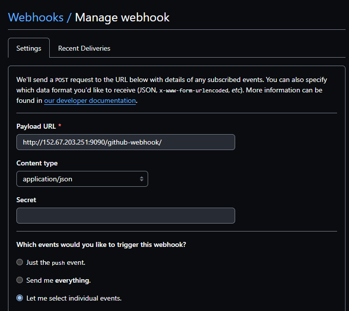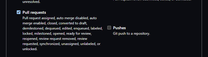 위 경로로 들어와서 webhooks 설정에서 Pull requests를 선택합니다.