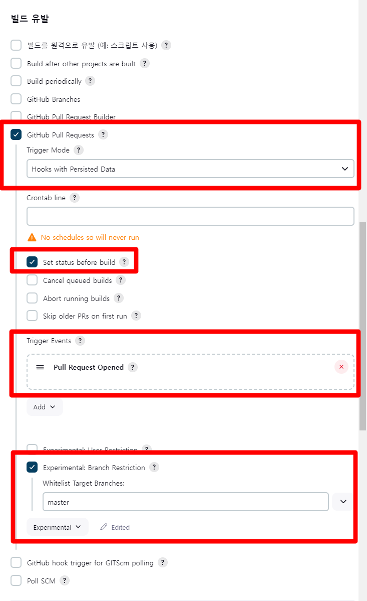 빌드 유발에서 GitHub Pull Requsts를 선택해줍니다.