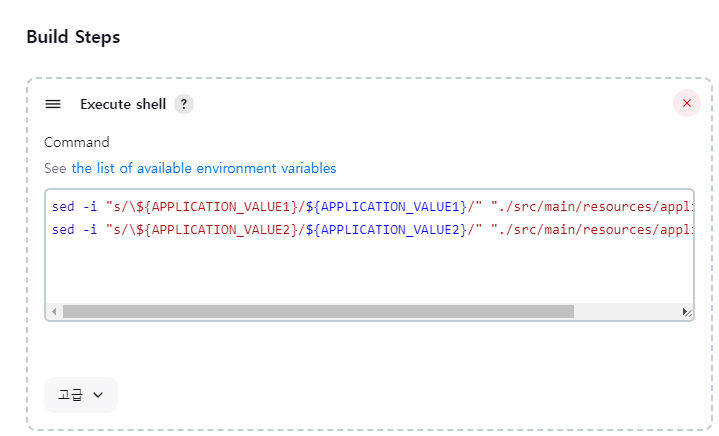 Build Steps에 Execute shell을 추가하여 최상단으로 옮겨 주고 아래와 같이 sed 명령어를 통해 application-dev.yml에 있는 환경변수를 Jenkins에 등록한 환경변수로 수정해줍니다.
