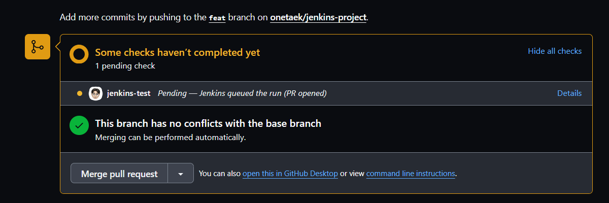 여기까지 진행 후 Pull Requst를 생성하면 아래와 같이 pending 상태로 jenkins의 build 과정을 기다리게 됩니다.