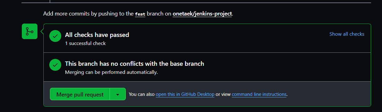 Build가 성공했을 경우에 Pull Request도 성공 상태로 수정하여 Merge가 가능하게 됩니다.