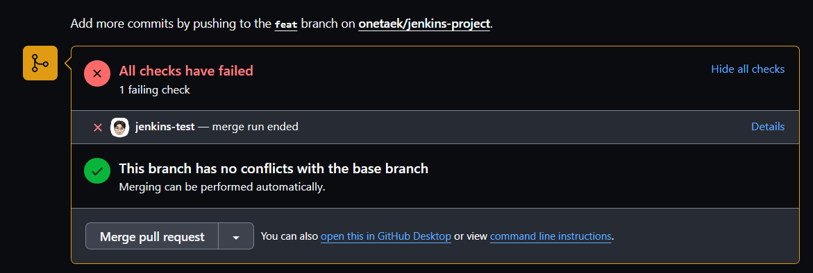 Buil가 실패했을 경우 Pull Reuqest도 실패 상태로 수정하여 Merge를 할 수 없게 됩니다.
