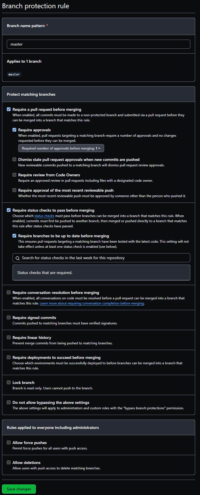 Require a pull request before merging : 함부로 merge 할 수 없도록 pull requst를 통해서만 merge할 수 있도록 설정