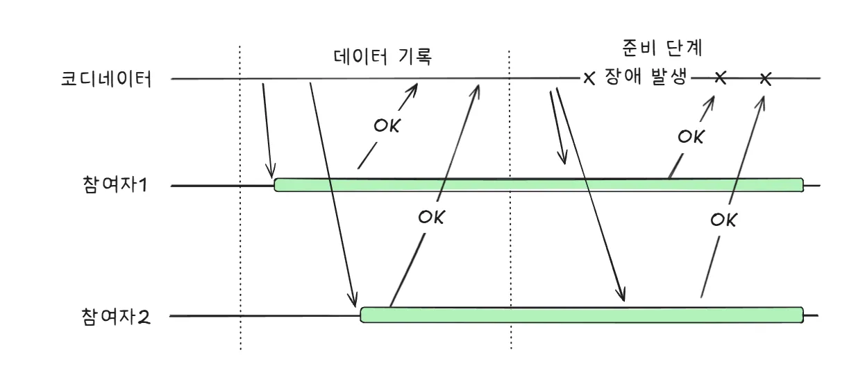 - 참여자는 장애를 복구한 뒤에 트랜잭션 로그를 확인해서 준비 상태인 작업에 관해서