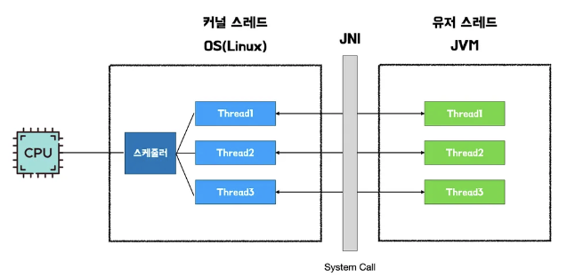JVM에서 제공하는 스레드를 플랫폼 스레드라고 말하며, JNI를 통해 시스템 콜을 호출하고 커널 스레드를 생성함으로써 플랫폼 스레드는 커널 스레드와 1:1로 매핑된다.