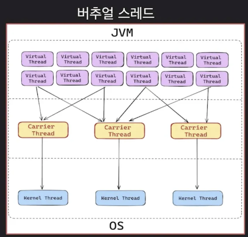 가상 스레드는 커널 스레드와 1:1로 매핑한 캐리어스레드 위에서 동작하고, 가상 스레드와 캐리어 스레드는 M:N으로 매핑된다.