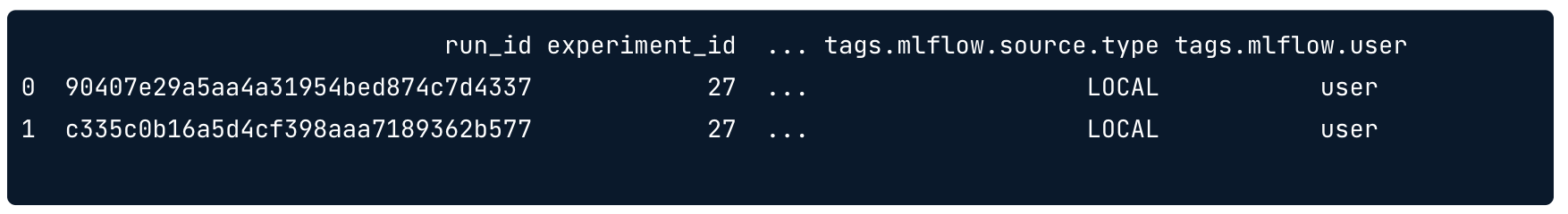 이런 pandas dataframe 형태로 출력된다. (기본적으로 mlflow의 search_runs의 return 값은 pandas 출력으로 나옴)