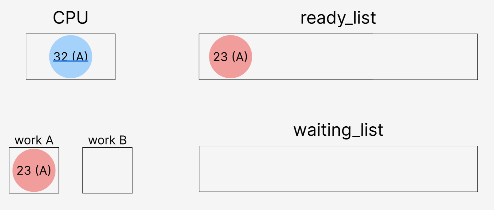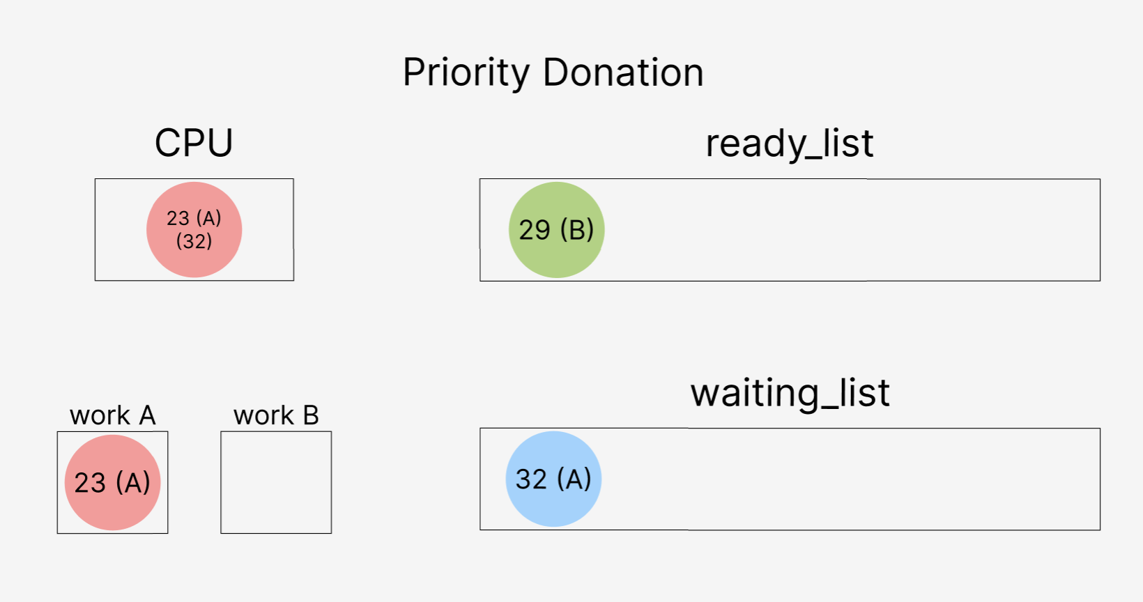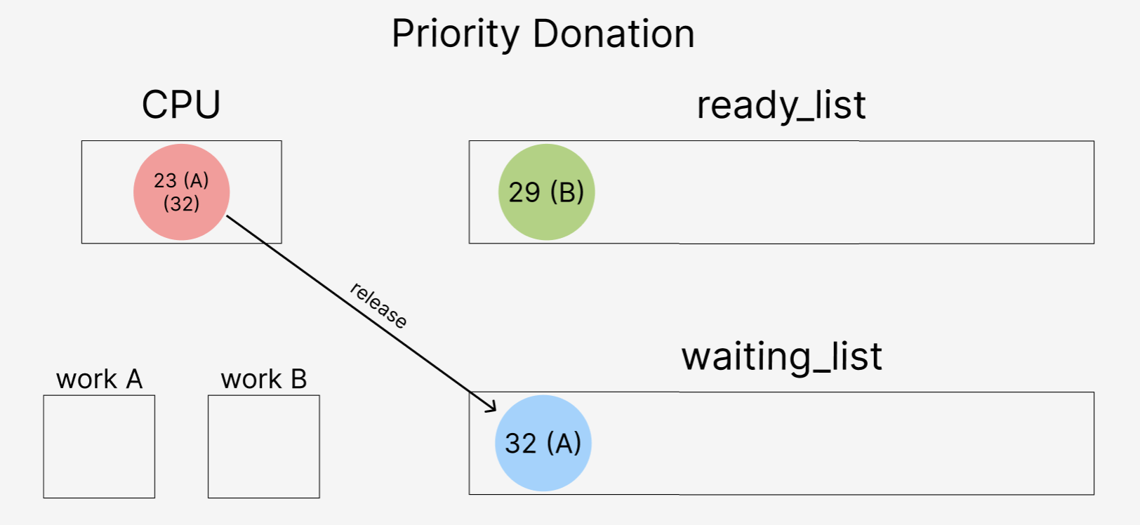 32를 donation 받은 23은 작업이 완료되면 waiting_list에 있던 32를 release 하고, ready_list로 옮긴다.