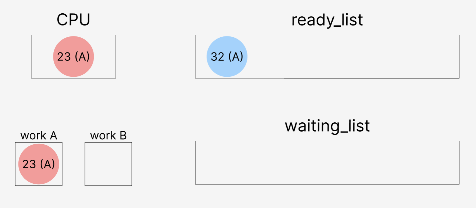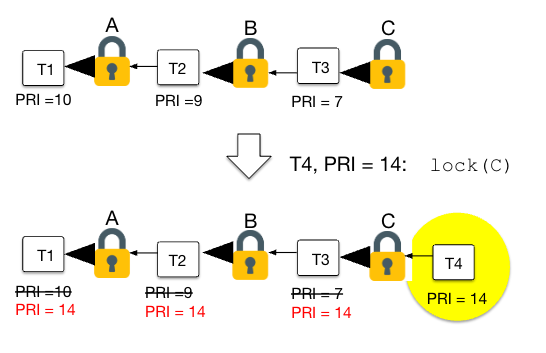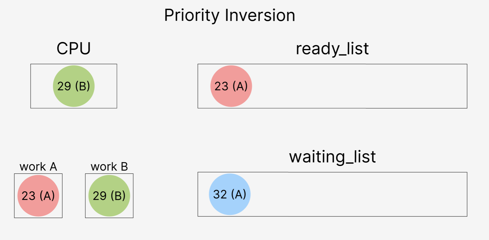 낮은 우선순위 스레드 A가 락 23을 가지고 있고, 높은 우선순위 32가 A를 기다릴 때: