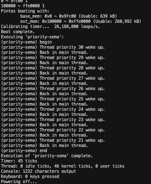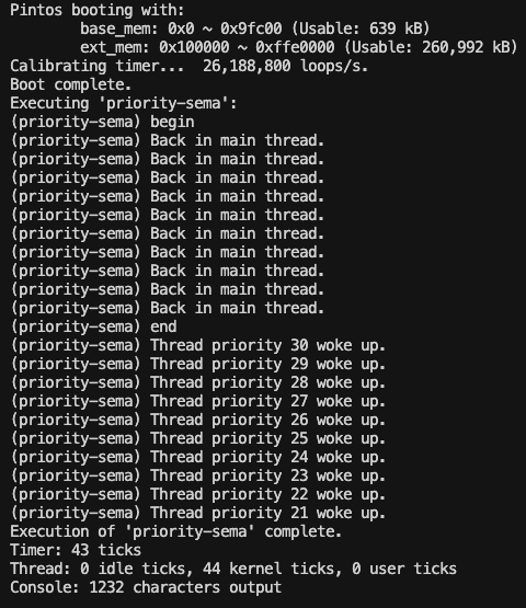 thread_create()가 호출 되었을 때, 한 스레드 씩 작업을 하게 만들면 되는거 아니야?라는 생각으로 계속 아직 완벽히 이해하지 못한, lock()을 사용해 보기도 하고, semaphore를 계속 이 사이에 넣어보면서 테스트 해보았는데