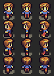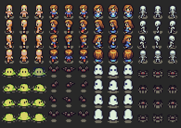우리가 load한 이미지는 여러 캐릭터 이미지를 포함하고 있습니다. 이것을 스프라이트 시트라고 합니다. 스프라이트 시트의 각 이미지는 프레임이라고 부르고 왼쪽 상단이 0번 프레임입니다.