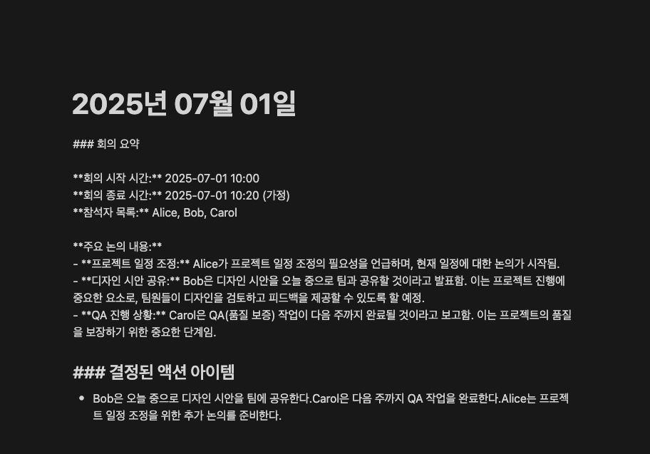 향후에는 STT 도구를 추가해 오디오 기반 회의 요약을 실시간으로 처리하거나, 요약 결과를 Slack, Google Docs 등 다른 협업 도구로 확장하는 것도 어렵지 않습니다.
