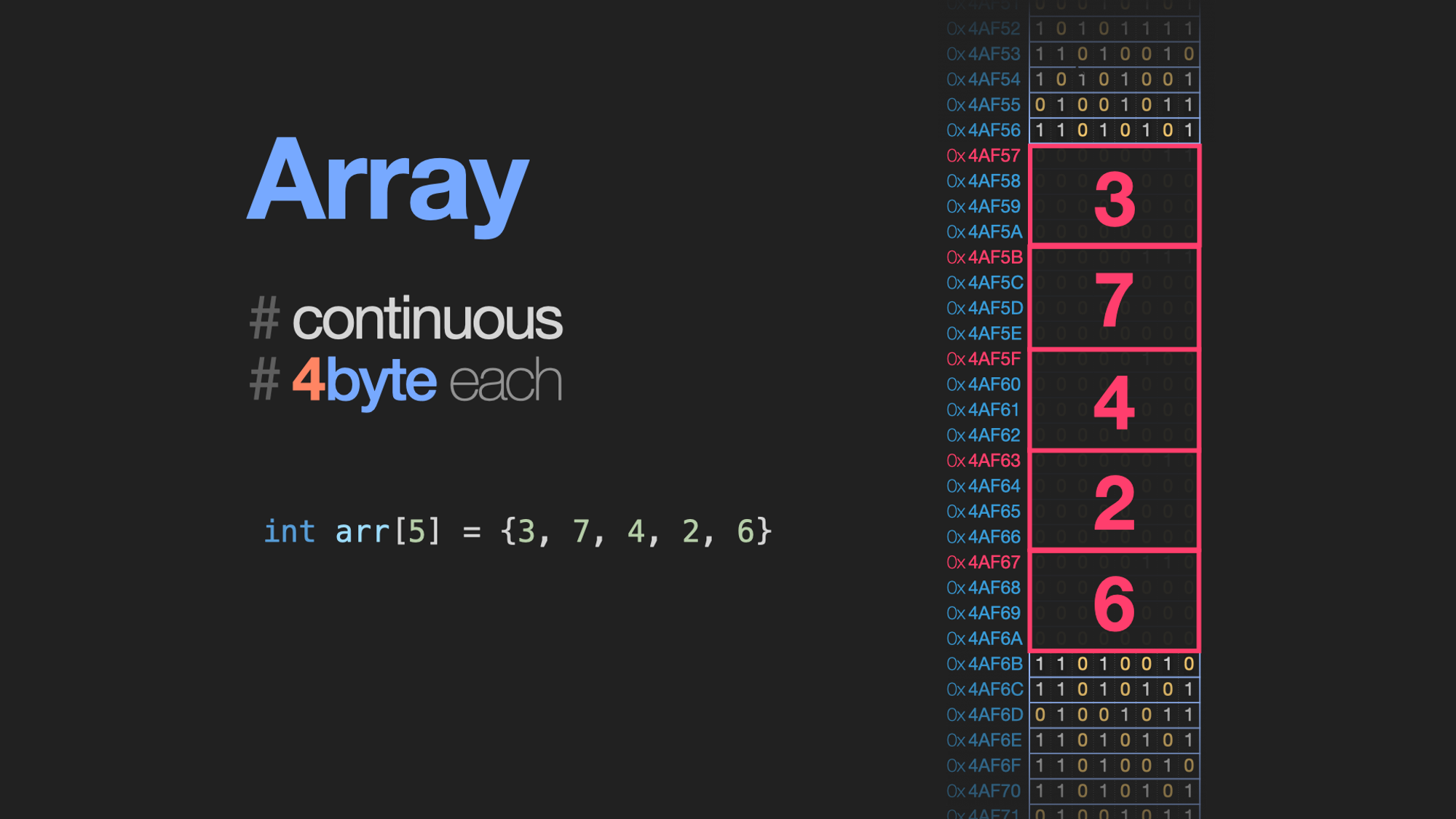 배열은 연속적/순차적으로 저장되어 있기 때문에 첫 주소값만 알고 있다면 어떤 index에도 즉시 접근이 가능하다. 아무리 긴 배열이더라도 한번의 연산으로 원하는 데이터에 바로 접근할 수 있기 때문에 O(1)의 시간 복잡도를 갖는다.
