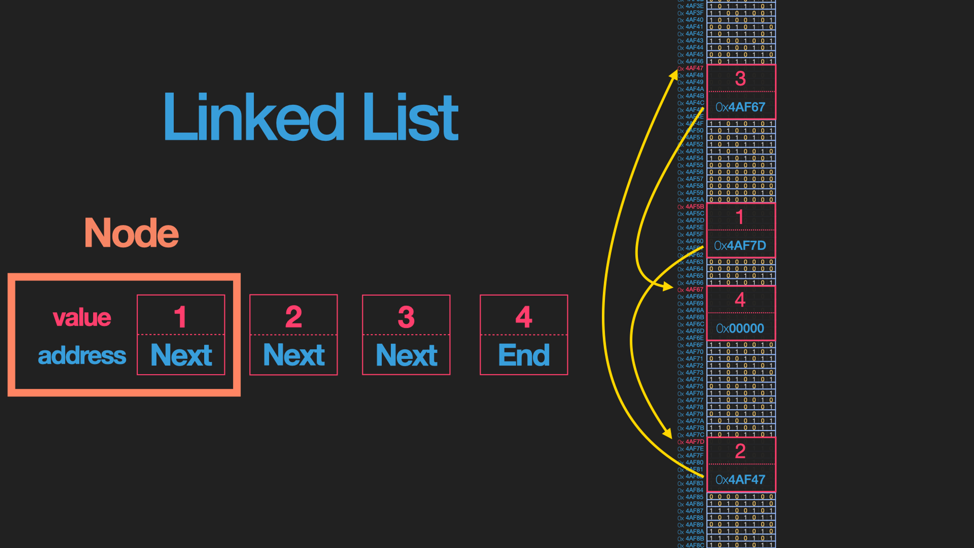 Linked List는 메모리상에서 비연속적으로 저장이 되어 있지만, 각각의 node가 다음 노드의 메모리 주소 값을 가르킴으로써 논리적으로 연속성을 갖게 된다.