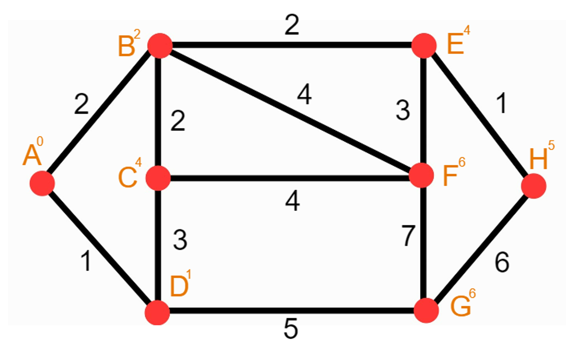 위 사진과 같은 가중치 그래프가 주어지고 시작점은 A, 도착점은 H라고 가정한다.