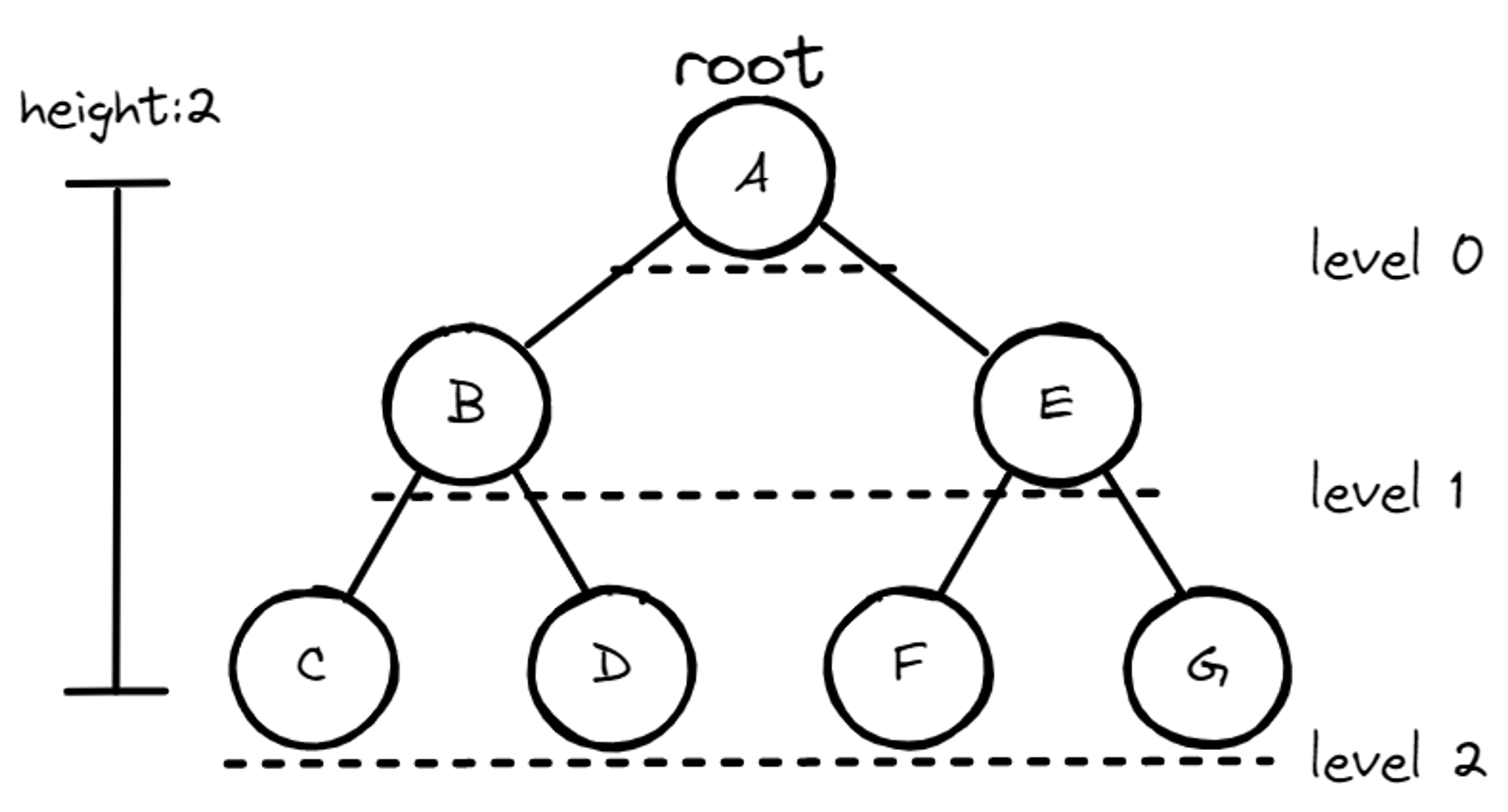 - 높이(Height): 루트 노드에서 가장 멀리있는 리프 노드까지의 거리이다.