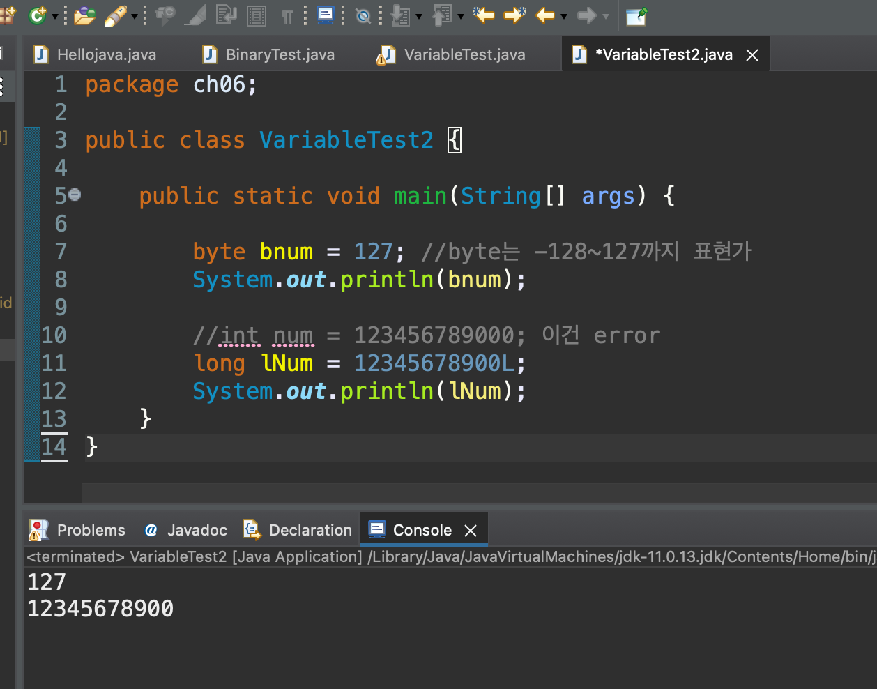 - 숫자의 뒤에 알파벳 L 또는 l을 써서 long 형임을 표시 함