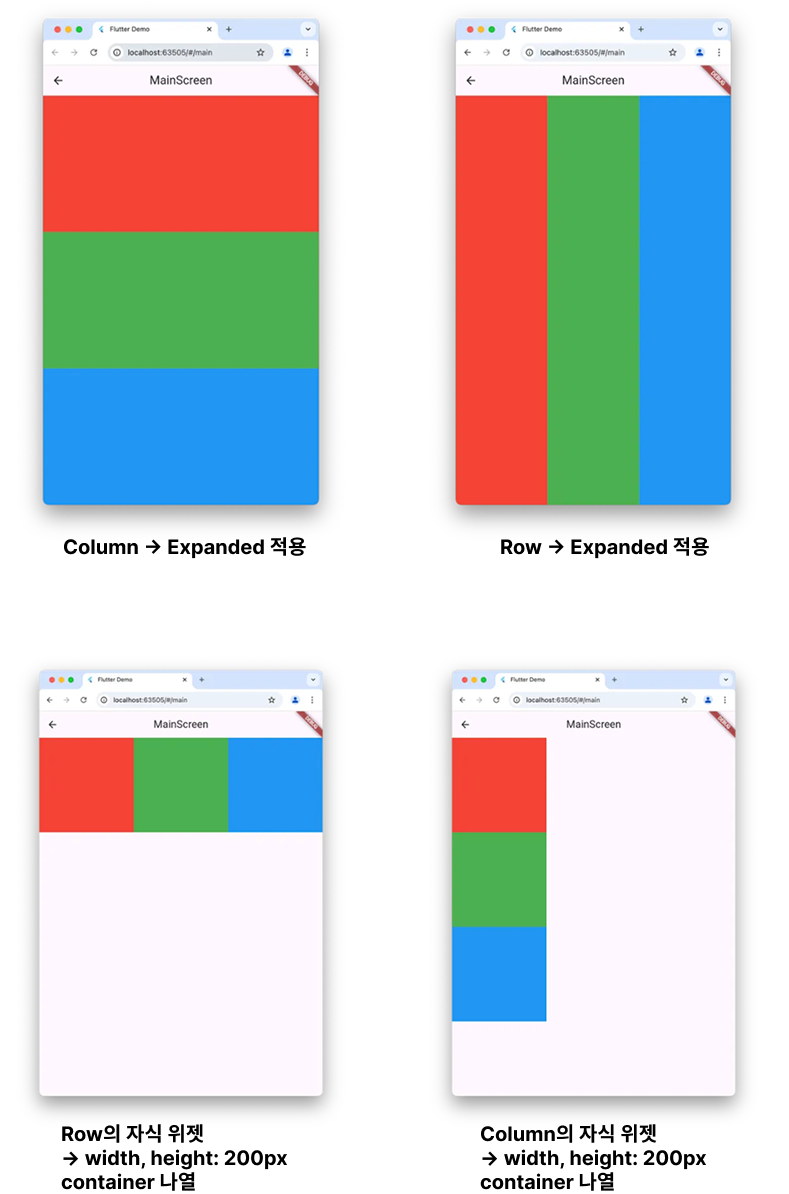 아래 코드의 예시는 3개의 Expanded가 존재하기 때문에 Column의 고유 Height 만큼을 각각 1/3 씩 나눠가짐