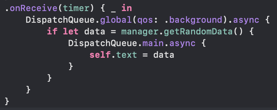 let timer = Timer.publish(every: 0.1, tolerance: nil, on: .main, in: .common, options: nil).autoconnect()