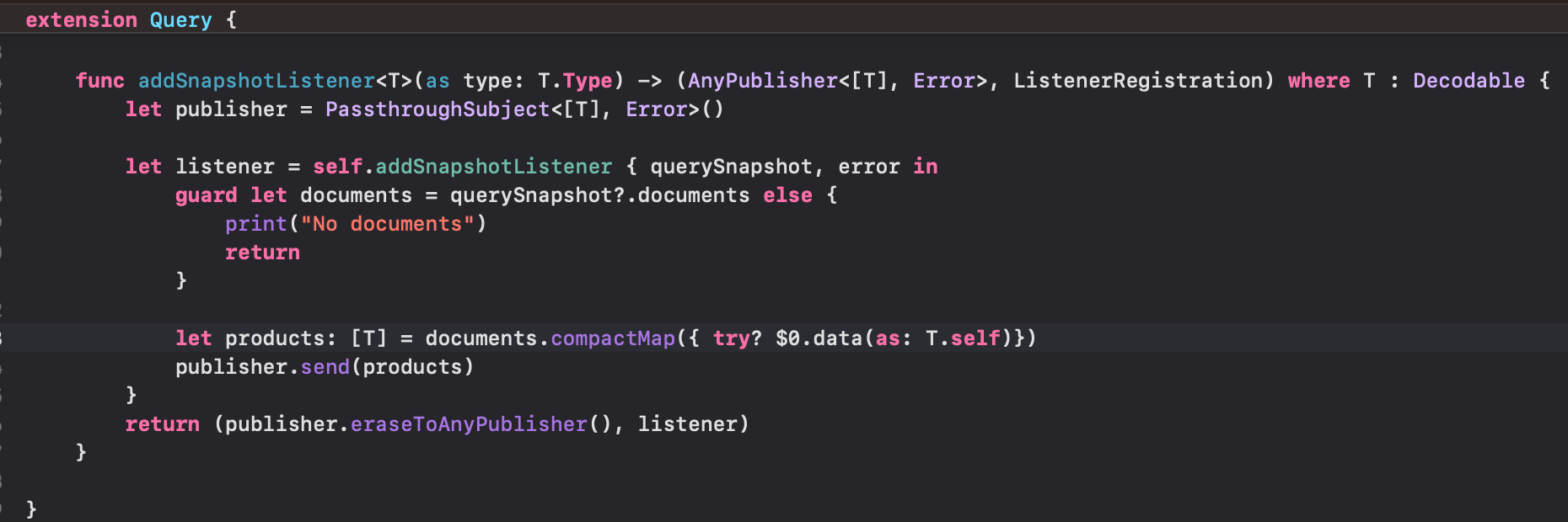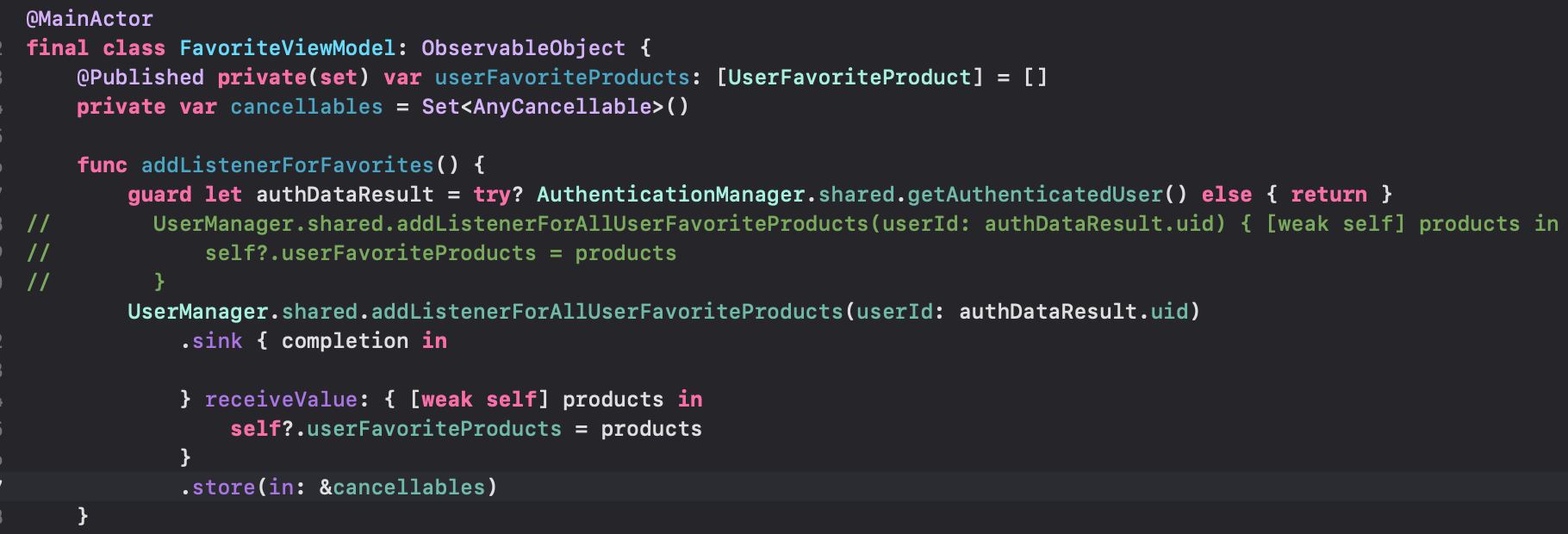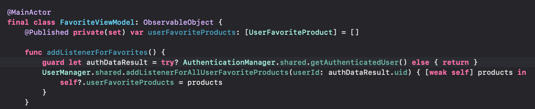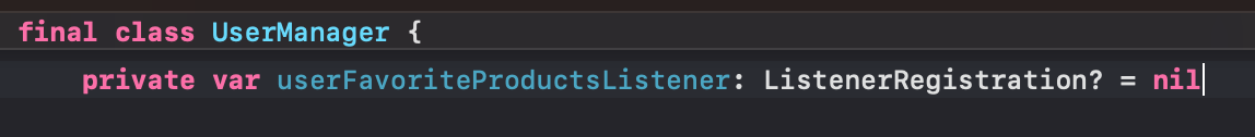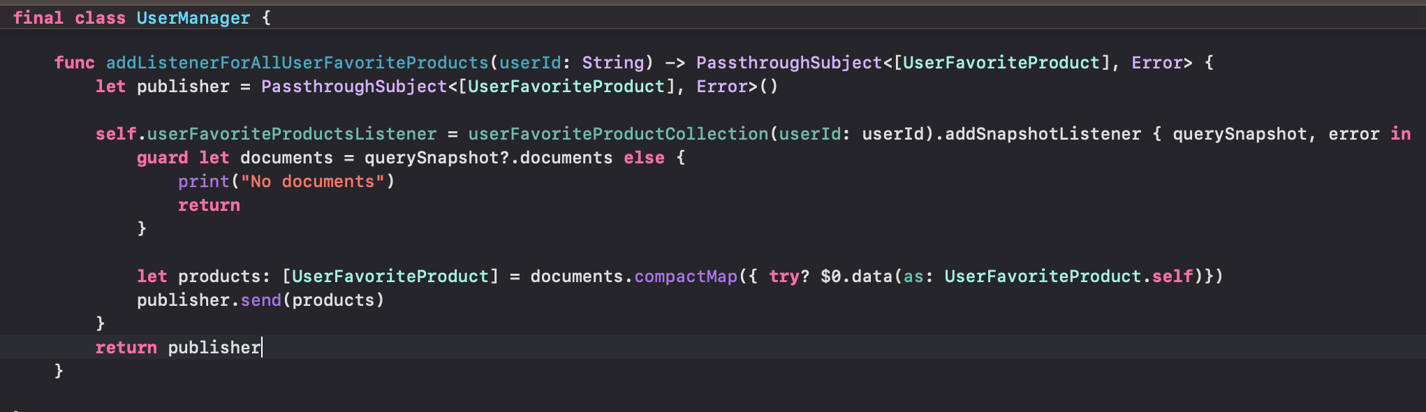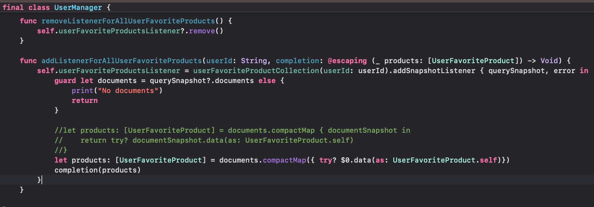 self.userFavoriteProductsListener = userFavoriteProductCollection(userId: userId).addSnapshotListener { querySnapshot, error in