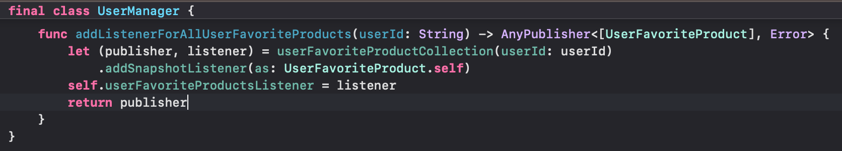 func addListenerForAllUserFavoriteProducts(userId: String) -> AnyPublisher<[UserFavoriteProduct], Error> {