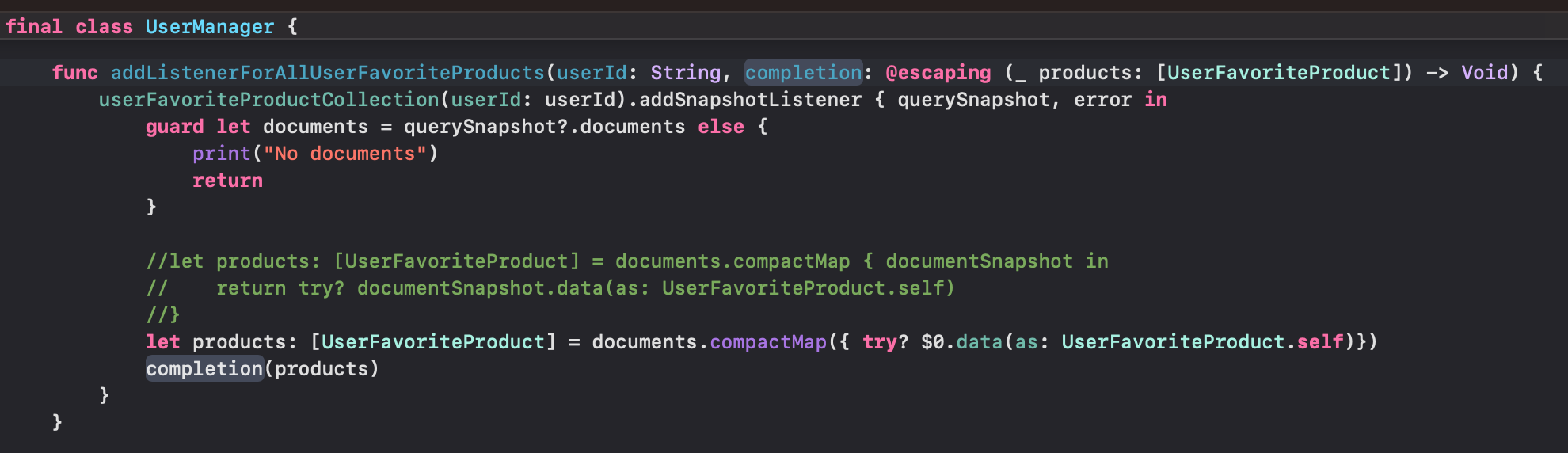 func addListenerForAllUserFavoriteProducts(userId: String, completion: @escaping (_ products: [UserFavoriteProduct]) -> Void) {
