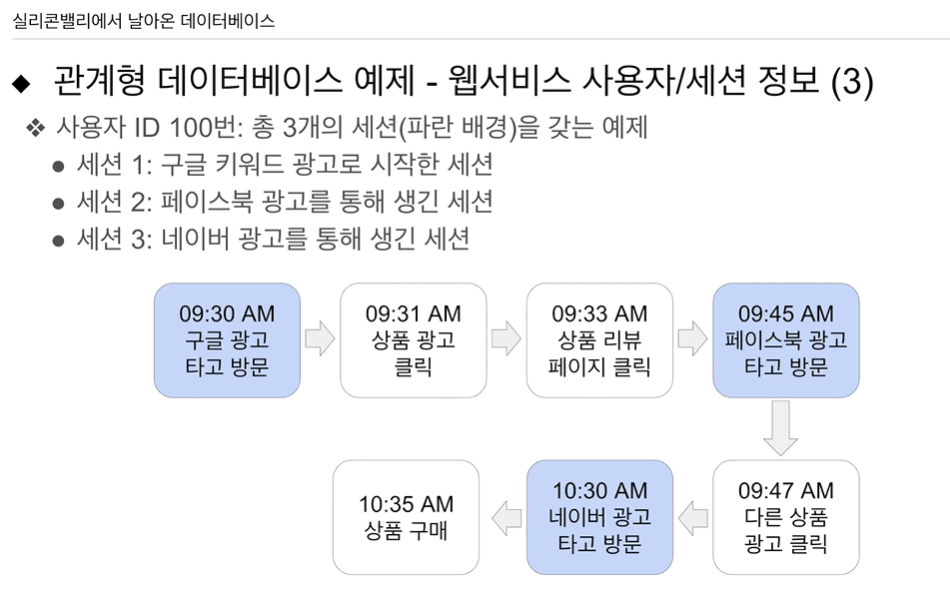 한 명의 사용자가 여러 세션을 만들 수 있고, 세션은 생성 시간도 기록한다