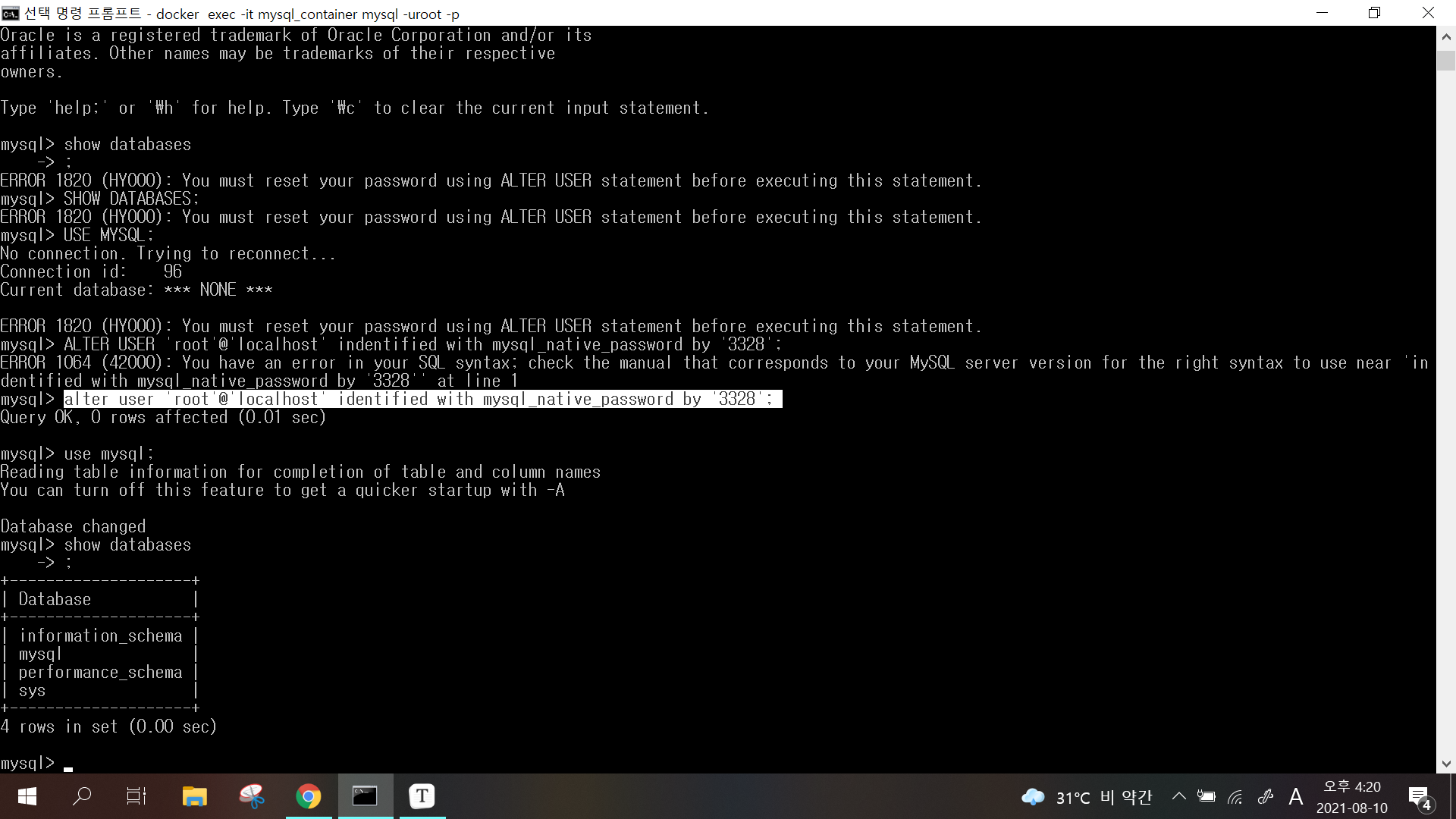docker exec -it mysql_container mysql -uroot -p처음에 mysql을 사용하면 번호를 바꿔야한다