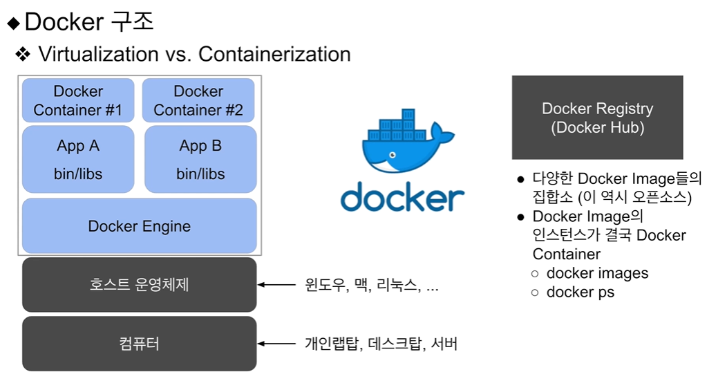 Docker는 특정 프로그램과 (그 프로그램을 실행하는데) 필요한 다양한 SW들을 하나의 패키지로 만듦으로서 해당 프로그램의 개발과 사용을 도와주는 오픈소스 플랫폼