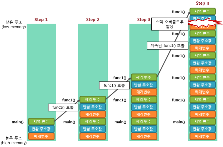 스택은 고정된 크기의 메모리 영역을 사용한다. 이때 메서드 호출이 너무 깊어지거나 지나치게 많은 지역 변수를 할당하면 스택이 가득 차는 스택 오버 플로우가 발생한다.