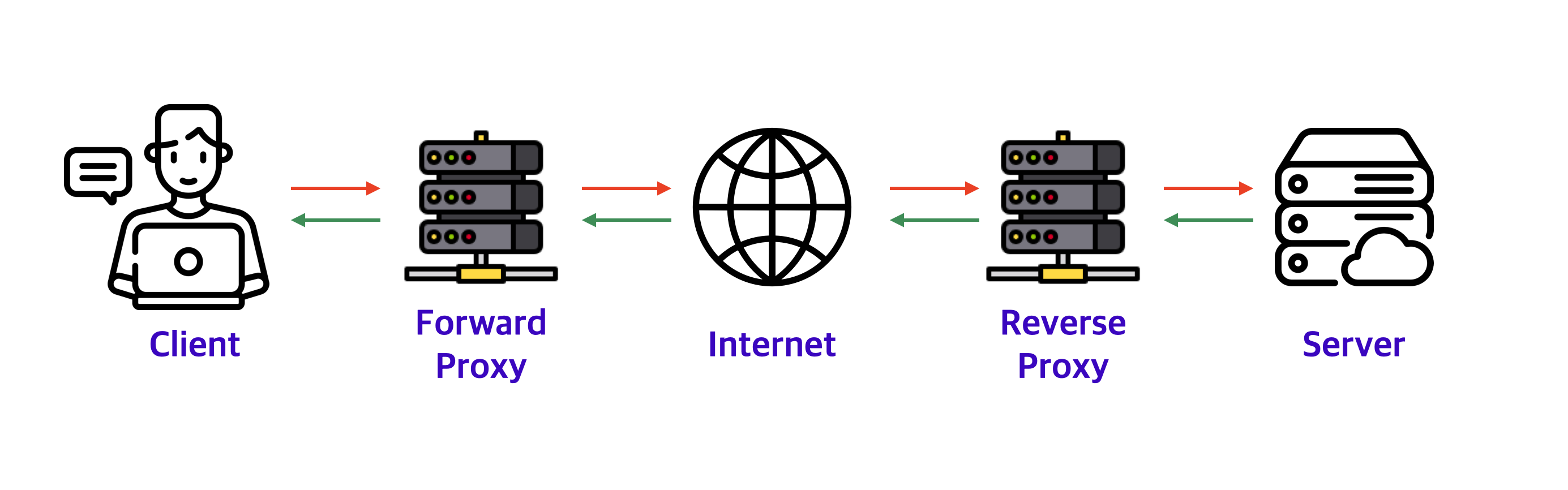 프록시(Proxy)는 말 그대로 대리인이라는 뜻으로, 클라이언트와 서버 사이에 위치하여 요청이나 응답을 중계하는 중간 서버를 의미합니다.