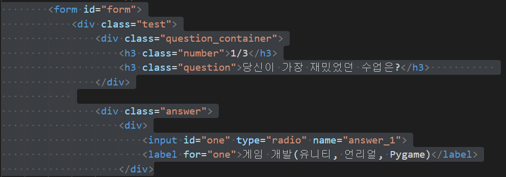 오늘은 설문조사 page를 클론 코딩하였다. form > input,label의 층위로 코드를 작성하였다. form은 사용자 반응을 받을 영역을 감싸주는 tag이다. input은 사용자의 반응을 받는 container로, 다양한 type을 제공한다. 체크박스는 type = "radio"를 지정해주면 된다. label은 이름 그대로 container에 붙는 꼬리표라고 생각하면 된다.
