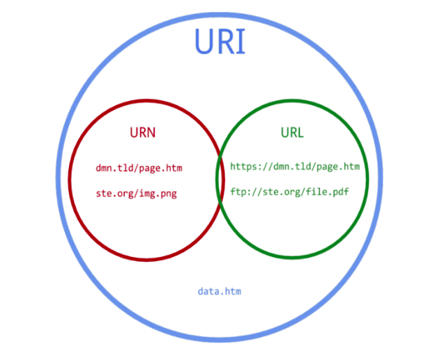 아래 그림에서 볼 수 있듯이, URI는 URL과 URN을 포함하고 있다. 이들의 각 뜻은 다음과 같이 정의할 수 있다