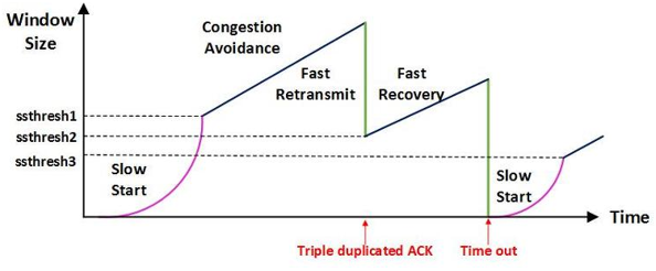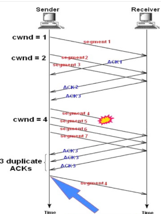 - 중복된 순번의 패킷을 3개 받으면 재전송을 하게 된다. 약간 혼잡한 상황이 일어난 것이므로 혼잡을 감지하고 window size를 줄이게 된다.