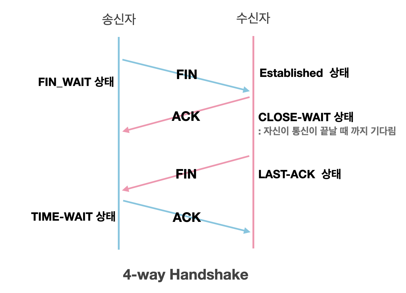 3-way handshake 를 통해 안전하게 세션을 생성하고, 데이터를 주고 받은 뒤 연결을 해제 하고자 할 때, 4-way Handshake 과정이 이루어 지게 된다