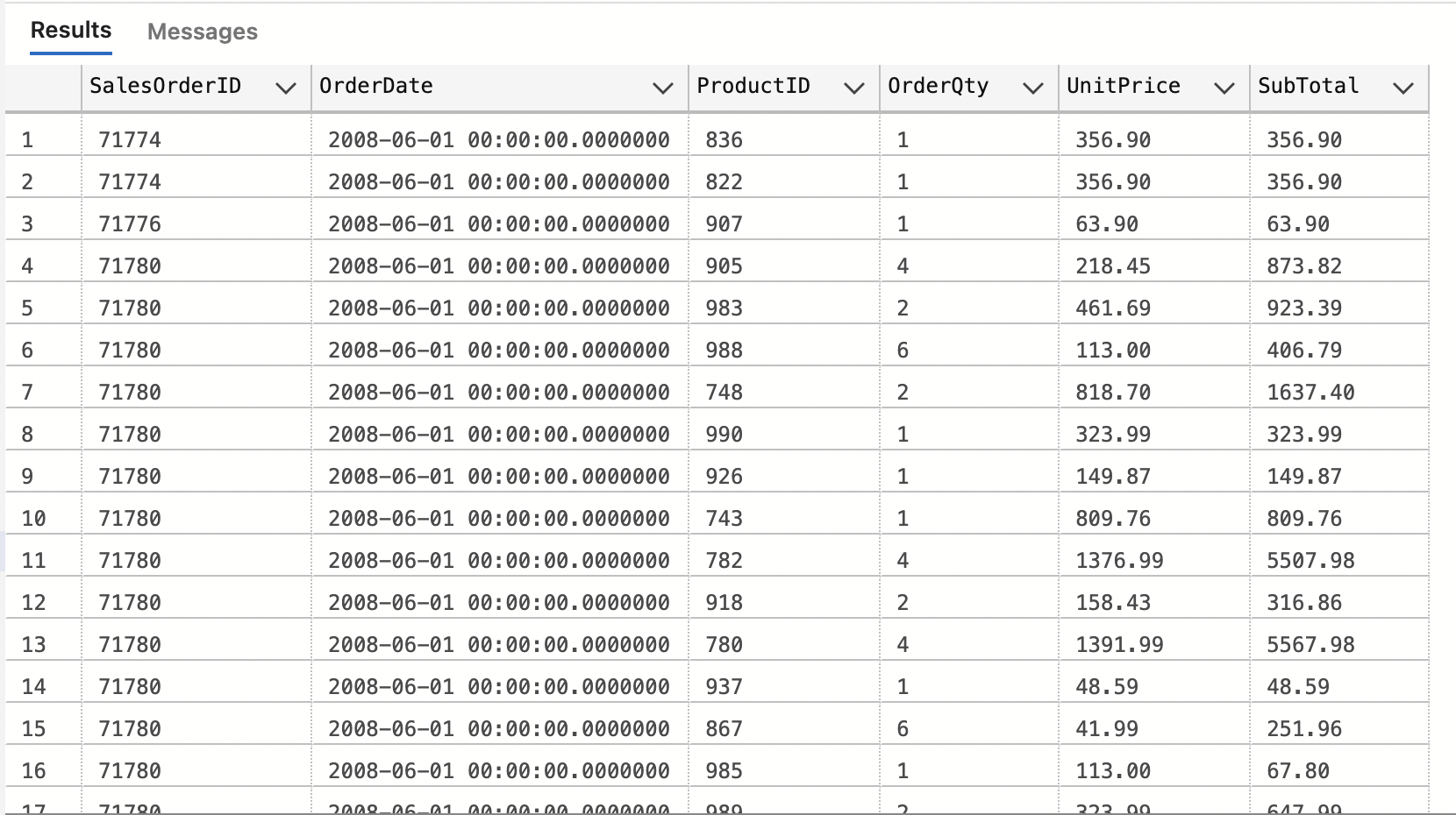 - 주문번호, 주문일자, 제품번호, 수량, 단가, 금액