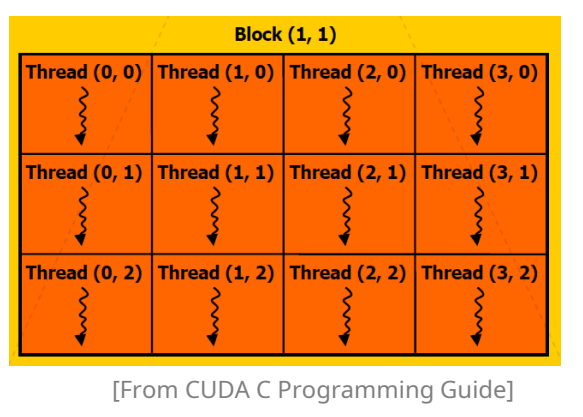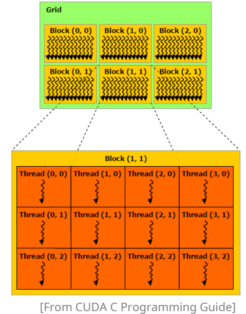 CUDA 프로그래밍 모델은 스레드→워프→블록→그리드 의 4단계 계층 구조로 이루어져 있음. cuda는 기본적으로 Thread 단위로 연산을 하기 때문에 Thread와 관련되 위계구조를 파악해야 함