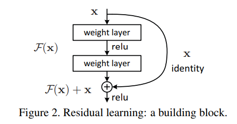 - 입력을 x, weight layer에 대항하는 함수를 각각 F(x) Residual block H(x)는 다음과 같이 표현이 가능함