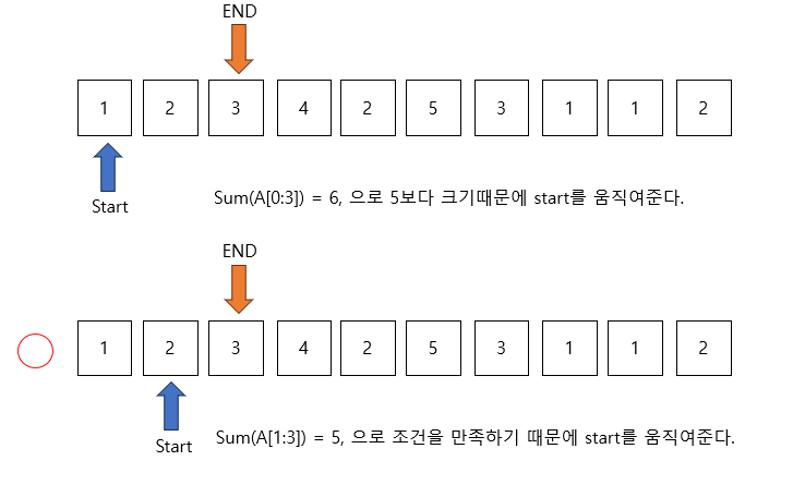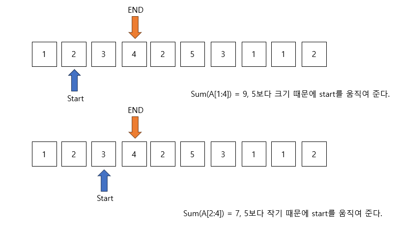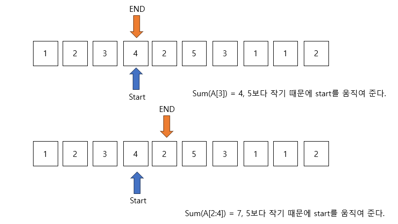 - 리스트의 부분합이 5보다 작다면 End + 1 을 계산해준다. End 값이 리스트의 마지막 인덱스의 값이 똑같게 된다면 Start + 1을 해준다.