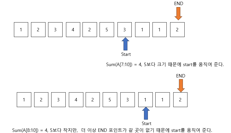 # 투포인터 기법으로 end와 start 둘다 사용함