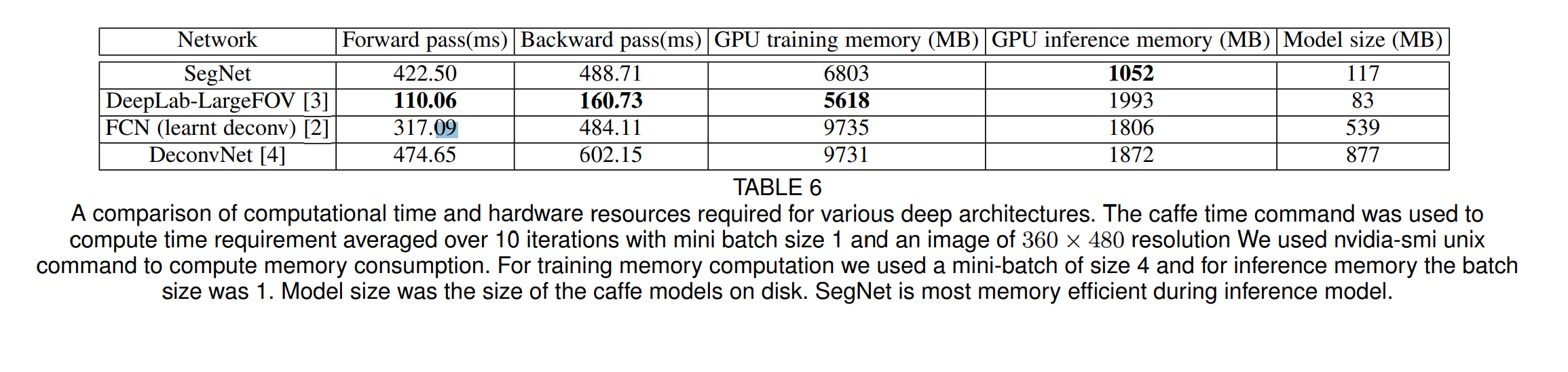 - 최종적으로 모델 평가를 해보면 FCN에 비해서 연산속도는 느리다. 왜냐하면 FCN 디코더의 경우에는 행렬연산을 하기 때문에 GPU 리소스를 효과적으로 활용할 수 있지만, 인덱스를 접근해야되는 Segnet의 경우에는 비효율이 발생함 (segnet : 422.5ms, FCN : 317.09)