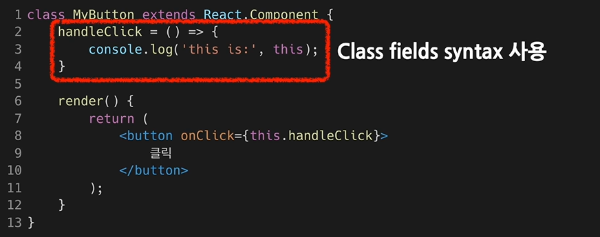 => 이는 자바스크립트의 공용 분법으로서 괄호 없이 사용하려면 무조건 해당 함수를 바인드해줘야 한다.