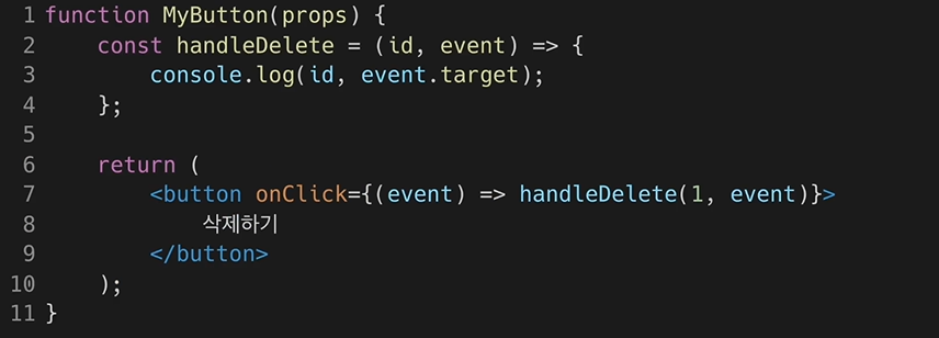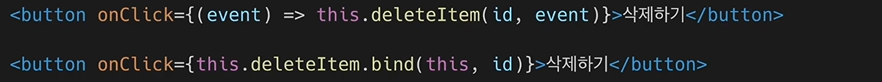 두번째 줄의 경우는 자동으로 id 를 bind 를 통해 전달하면 암묵적으로event객체가 전달된다.