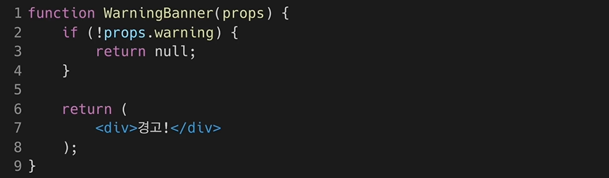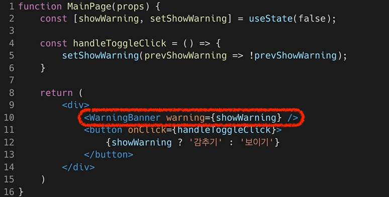 showWarning이라는 state 값을warningBanner컴포넌트의 props 로 전달하여 showWarning 값에 따라 해당 컴포넌트를 표시 또는 표시하지 않는다.