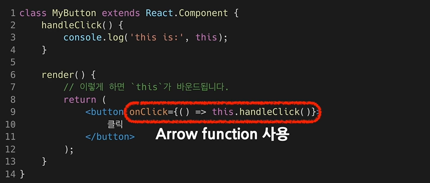 (클래스 컴포넌트에서는 화살표 유무가 바인드 유무 차이가 있었음)