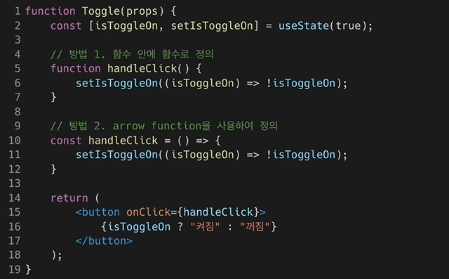 isToggledOn이라는 state 가 존재한다. 버튼 클릭 시handleClick함수가 호출된다.