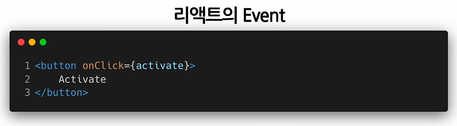 onClick으로 되며, 함수명을 이용하여 이벤트를 처리한다.