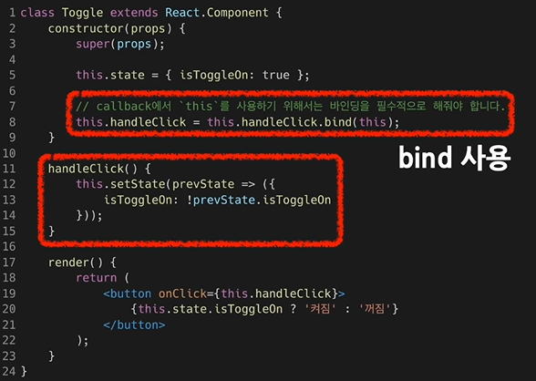 (바운드를 하지 않으면this.handleClick은 글로벌스코프에서 호출되는데 이렇게되면 undefined 가 된다.)