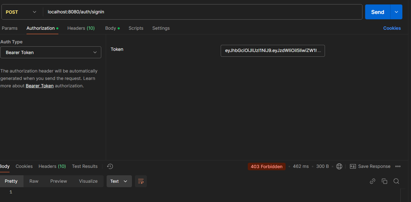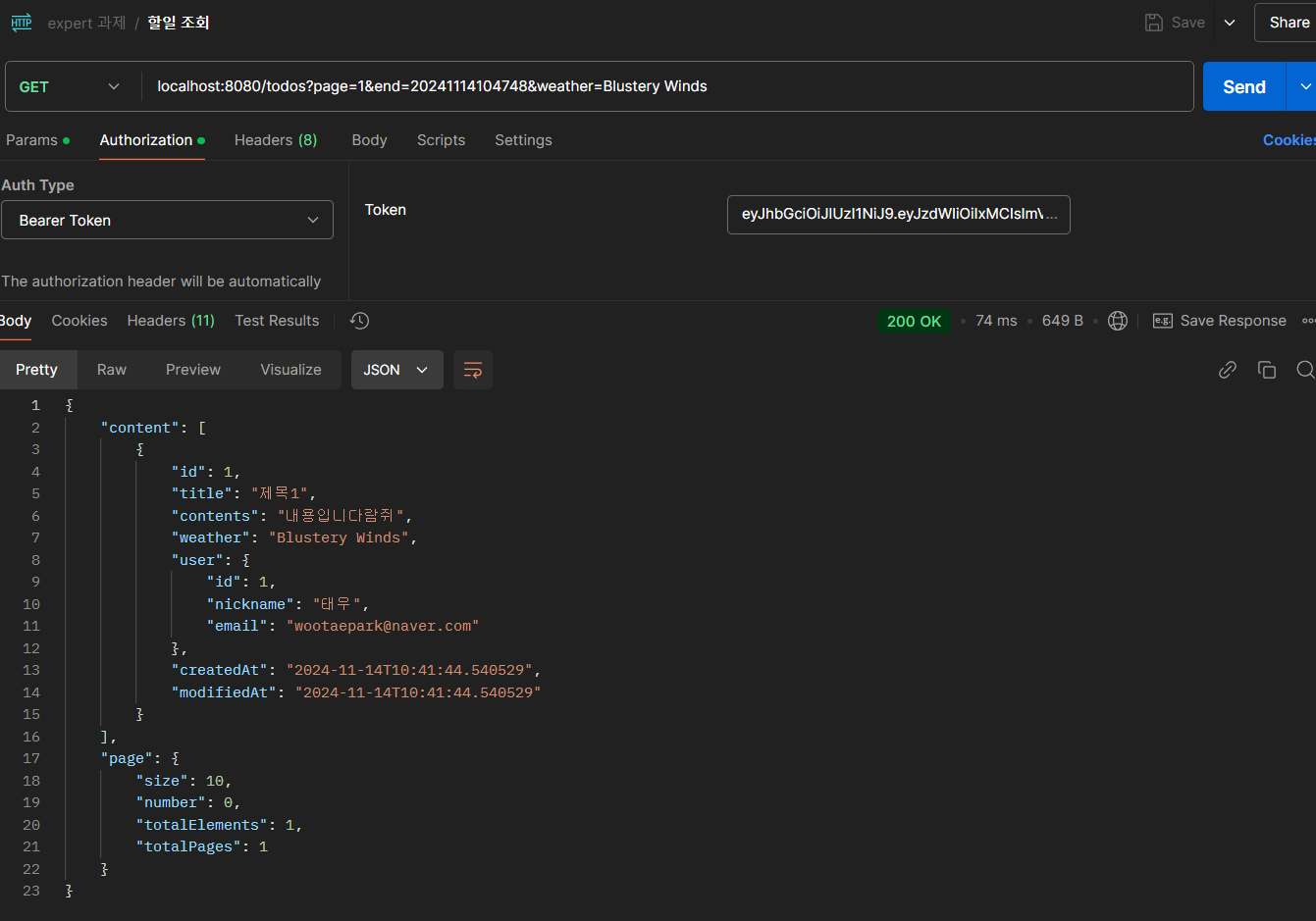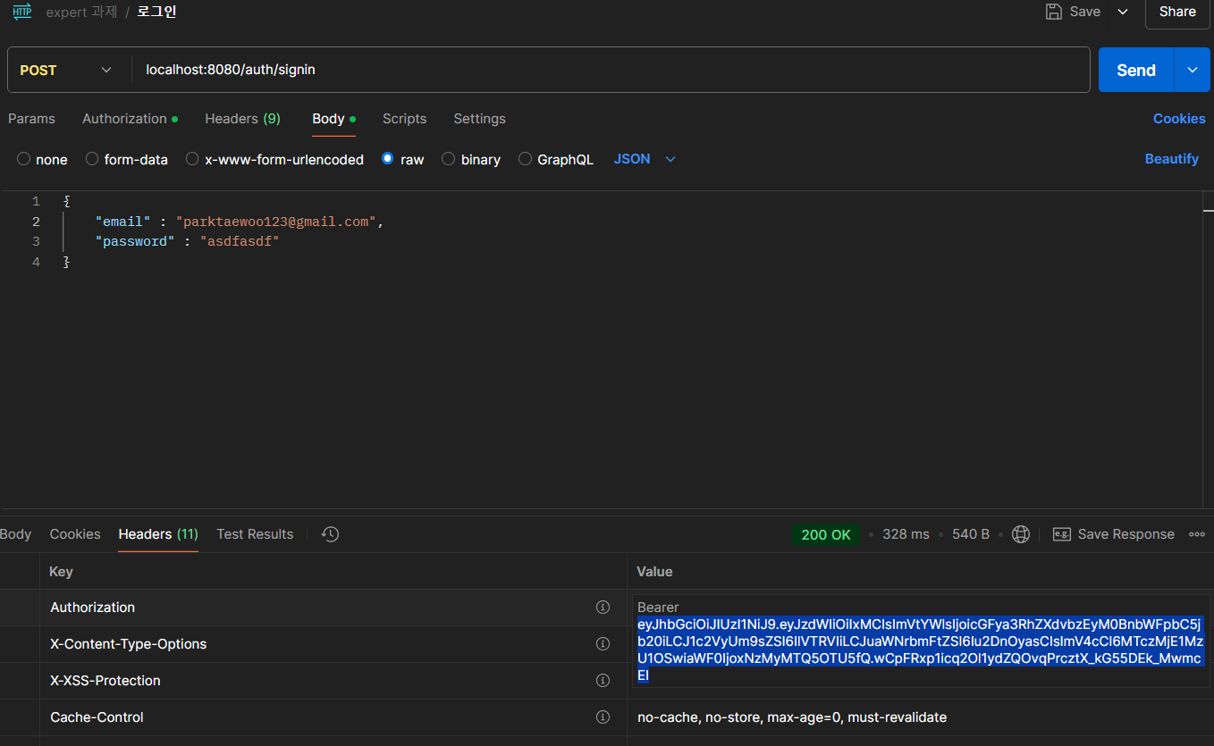 다음으로는 로그인 테스트였던 응답받은 토큰을 헤더에 넣고 테스트를 해보았다.