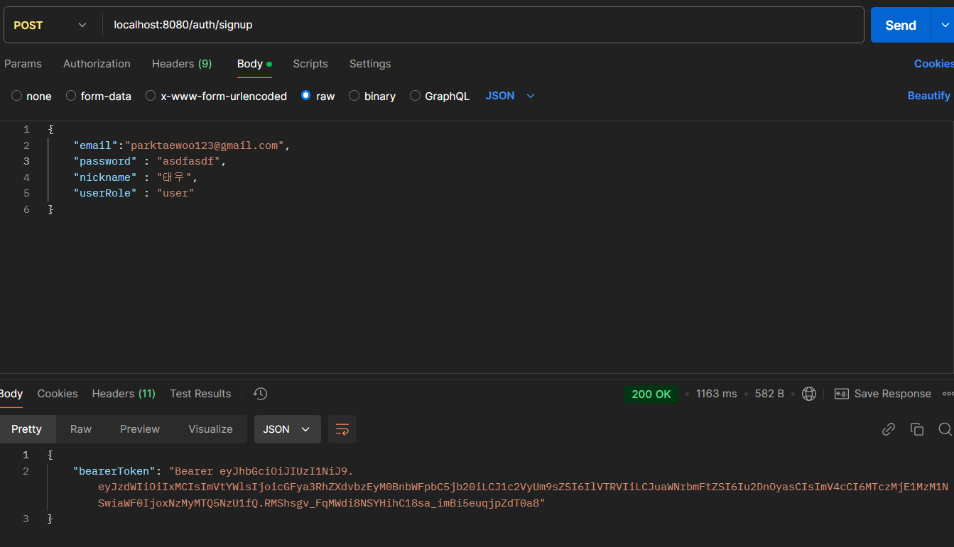 필수 구현 Lv 2-9 인 Spring Security 를 구현하고 api 를 테스트 하는 중이었다. 일단 회원가입을 테스트해 보았다.